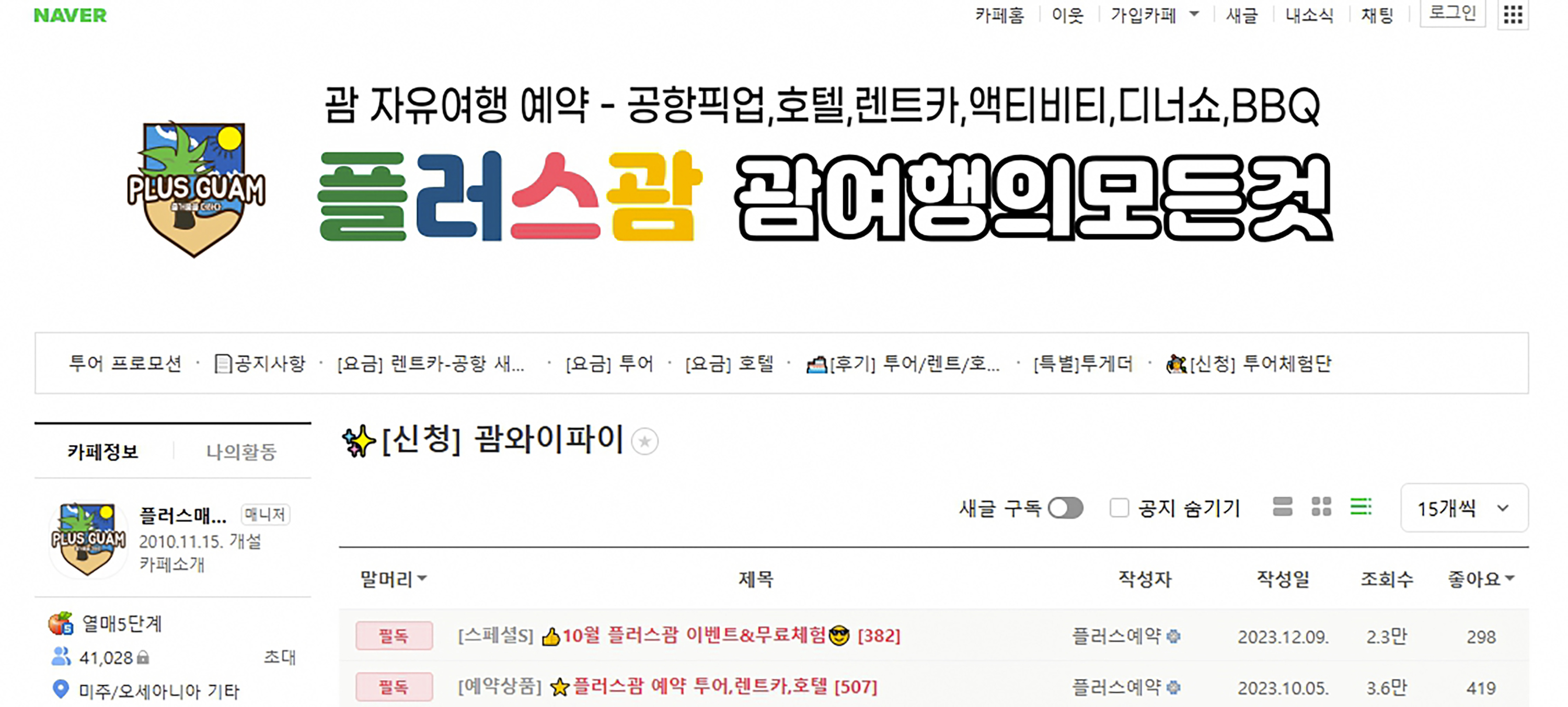 저처럼 괌 와이파이를 현지에서 빌리실 분들 같은 경우에는 일반적으로 포털에 검색하기 보다는, N사의 카페를 이용하는 것이 좋습니다. 제가 이용한 곳은 바로 '플러스괌'이라는 곳이었습니다. 게다가 여기에서는 일반적으로 비용을 내고 빌리는 것 외에도, 매달 이벤트로 무료 대여를 신청할 수 있기 때문에 비용을 절약할 수 있다는 장점이 있습니다.