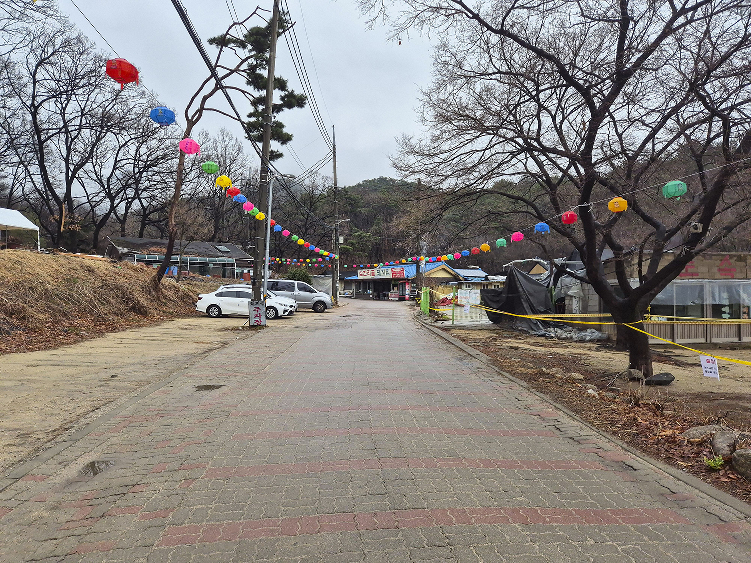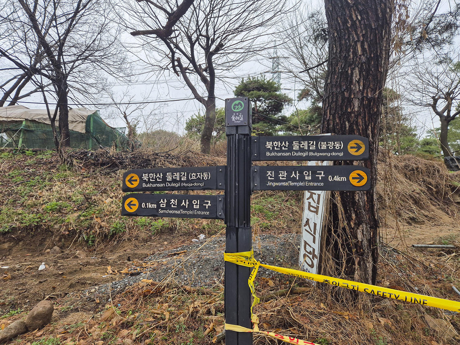 첫 낱개 이정표 직전에는 큰 도로에서 들어오는 길이 있어, 낱개 이정표를 찾는 것은 어렵지 않습니다. 이때 우측의 작은 길로 쭉 걸어가면 한옥마을 바로 옆 길을 통해 진관사까지 도착하실 수 있습니다.