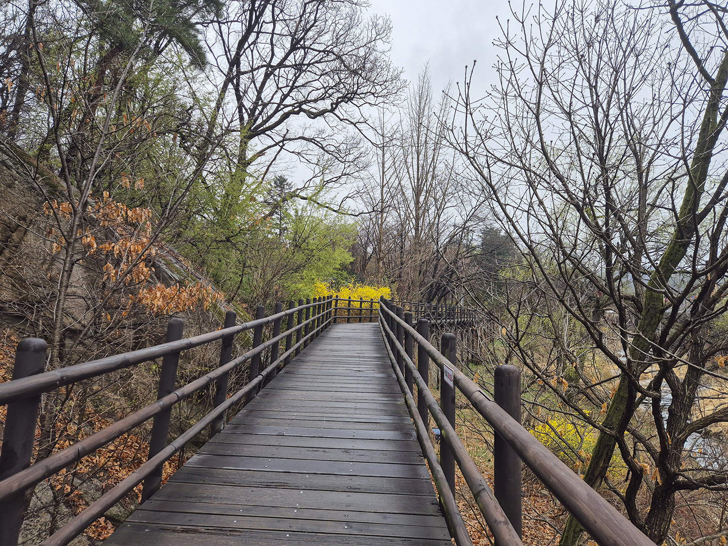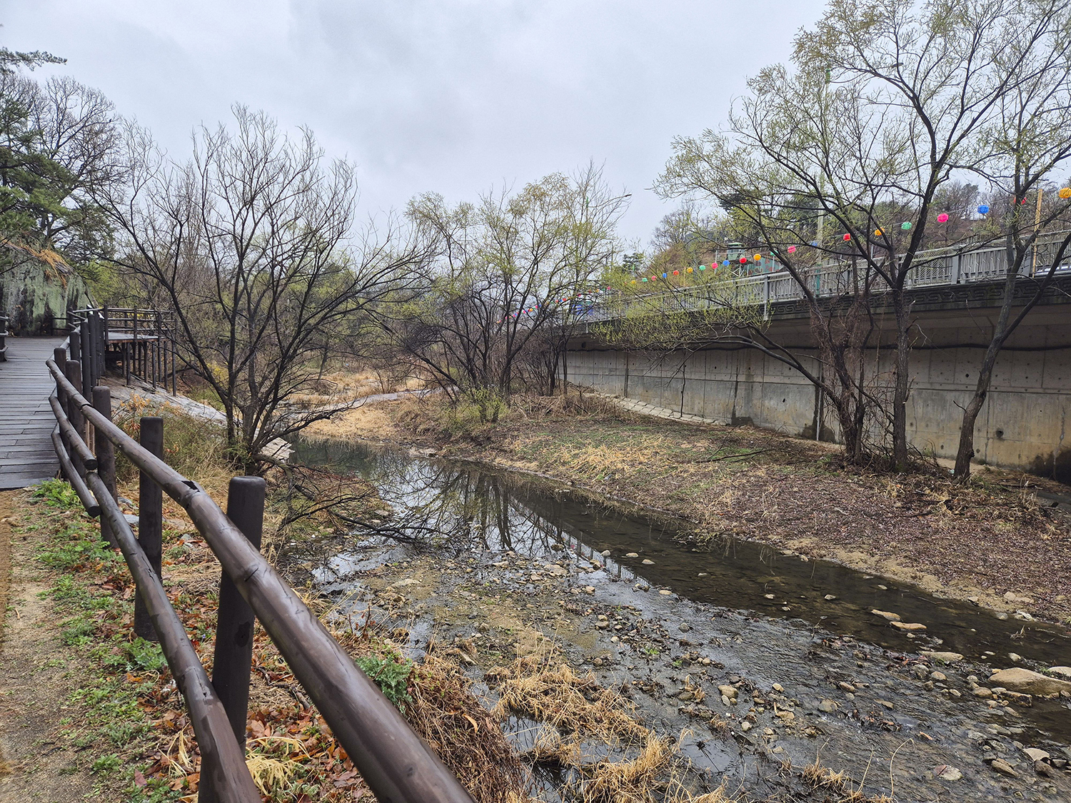 다육이 농장의 우측을 보면 작은 길이 있는 것을 볼 수 있습니다. 여기에는 장미 아치가 있으며, 그 길을 따라 쭉 가다 보면 넓은 너비의 데크로 구성되어 있는 산책로가 보입니다. 여기에서는 바로 옆에 흐르는 개울물을 구경할 수 있으며, 천천히 걸어가기만 하는데도 자연스럽게 힐링이 되는 듯한 느낌을 느낄 수 있습니다. 쭉 따라가면 문화 안내판, 쉼터, 지도 안내판(B)형까지 지나치게 되며, 천천히 걸어도 5분 정도면 충분히 걸어갑니다.
