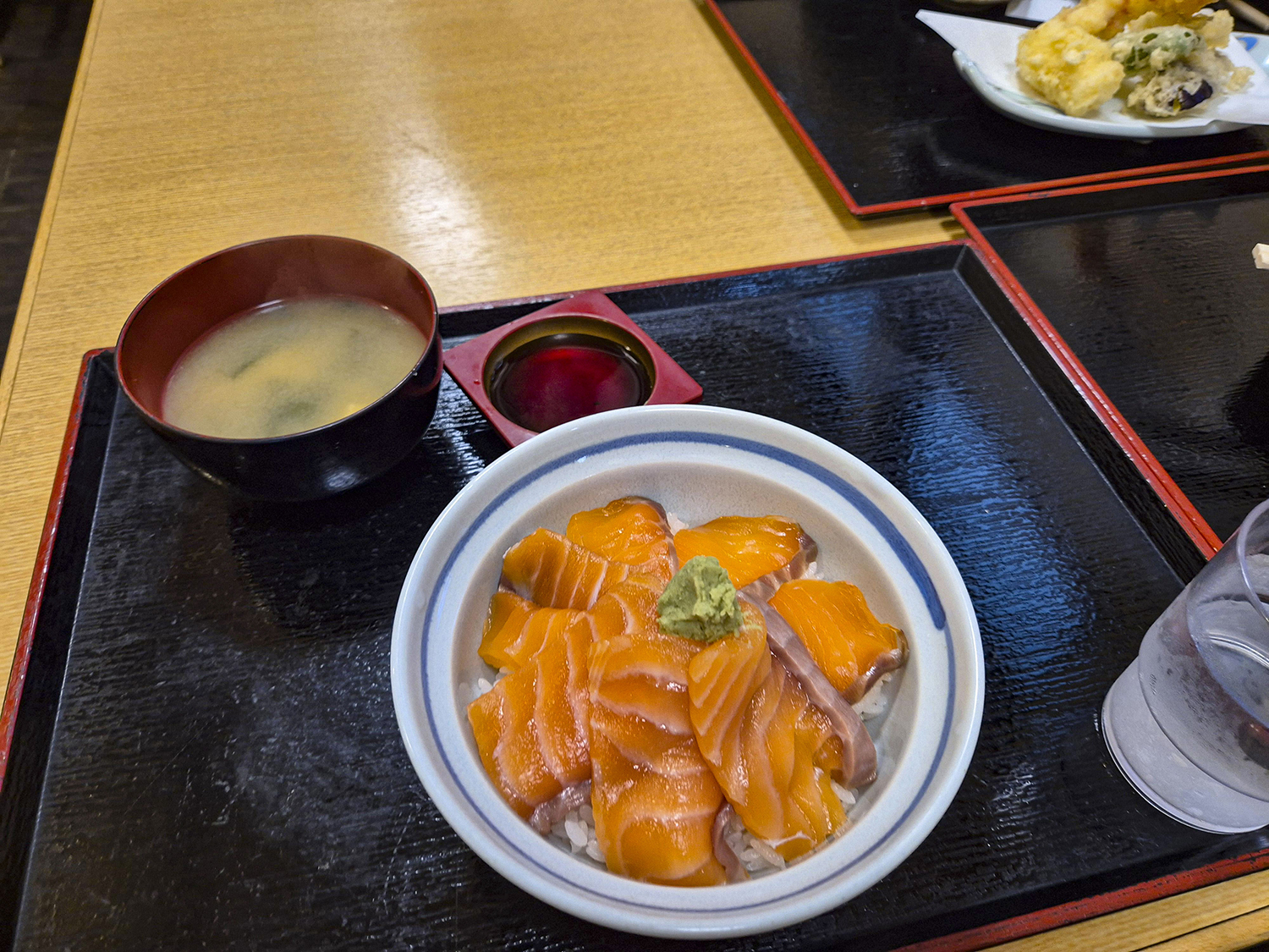 필자가 이번 삿포로 비에이 맛집에서 주문한 가장 비싼 음식입니다. 연어 덮밥이며, 하나에 2,100엔입니다. 역시 연어는 어느 나라로 가든 다 비싼 것 같습니다. 하지만 맛이 정말 좋기 때문에 선택에 후회가 남지 않으며, 같이 주는 소스를 뿌려서 와사비와 함께 먹으면 되기 때문에 먹는 방법이 정말 간단합니다.