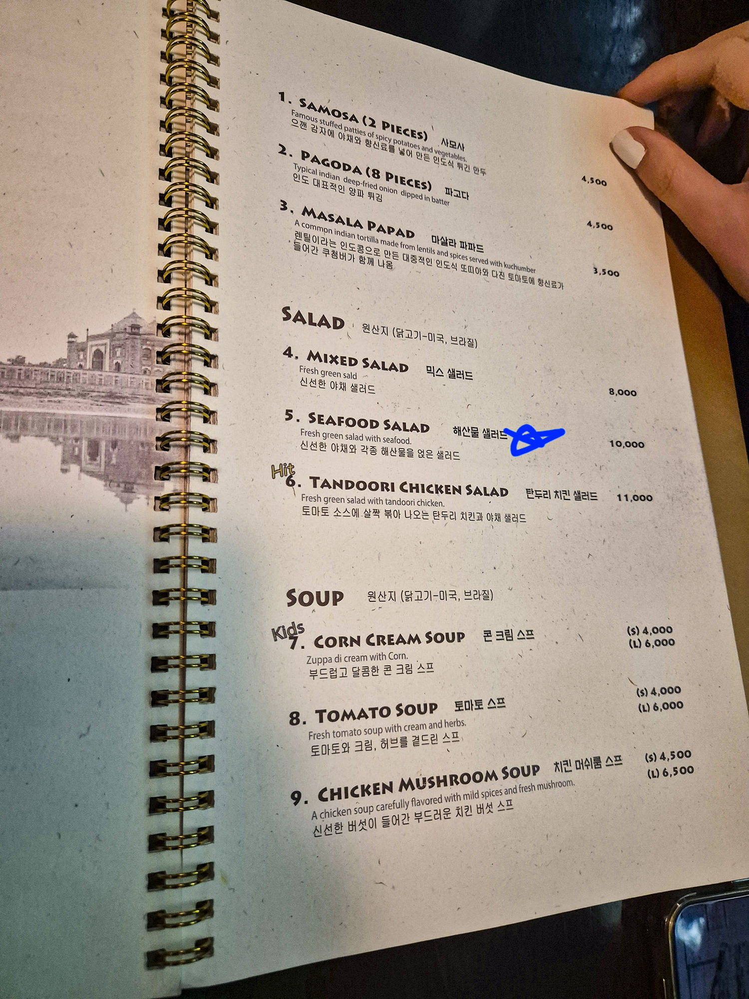 일산 인도 음식점 요리를 먹기 위해서는 메뉴들을 고르는 것이 가장 중요하다고 할 수 있습니다. 이에 대해서도 소개해드릴테니 참고하시면 좋을 것 같습니다. 참고로 필자의 경우에는 해산물 샐러드, 파니르 마크니, 그리고 프라운 빈달루를 선택했습니다. 그런데 여러분들에게 드리고 싶은 말은, 굳이 해산물 샐러드를 먹을 필요는 없고, 채식을 하신다면 믹스 새러드가, 아니라면 탄두리 치킨 샐러드가 좋다는 것입니다.