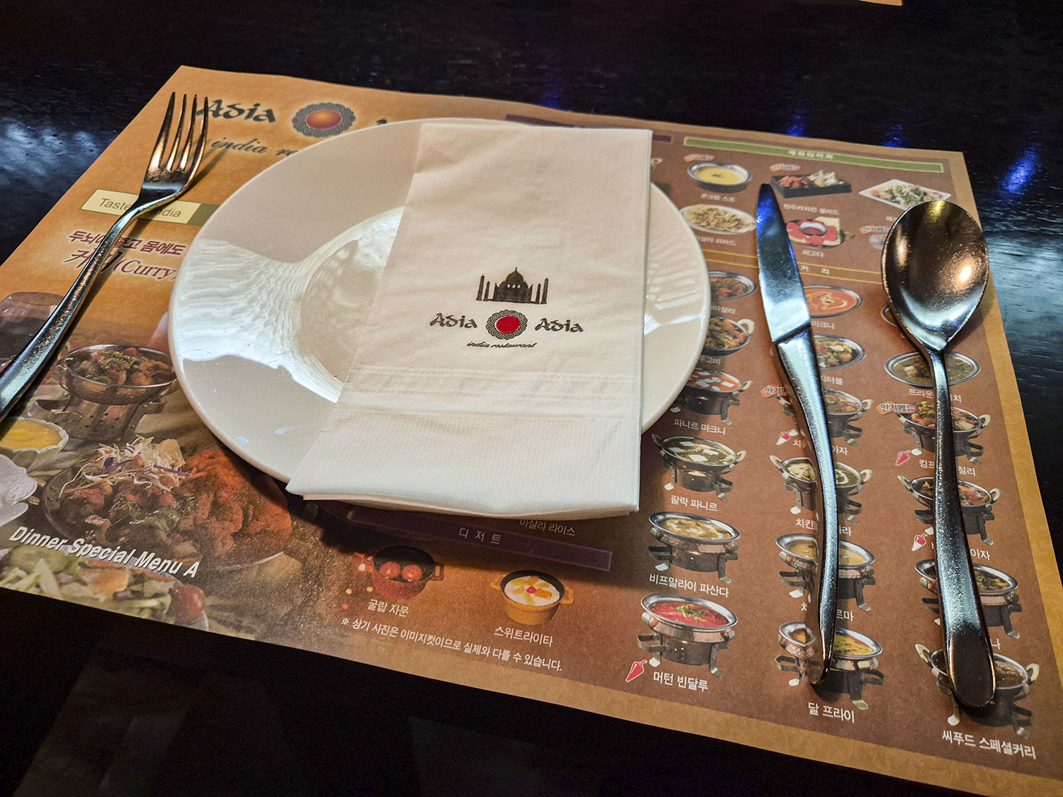 음식점 안에 들어가게 되면 테이블에 기본 셋팅이 놓여 있습니다. 메뉴 소개가 되어 있는 간단한 종이 한 장이 깔려 있고, 그 위에 접시와 식기, 그리고 음식을 흘리지 않도록 깔 수 있는 큰 냅킨이 준비되어 있습니다.